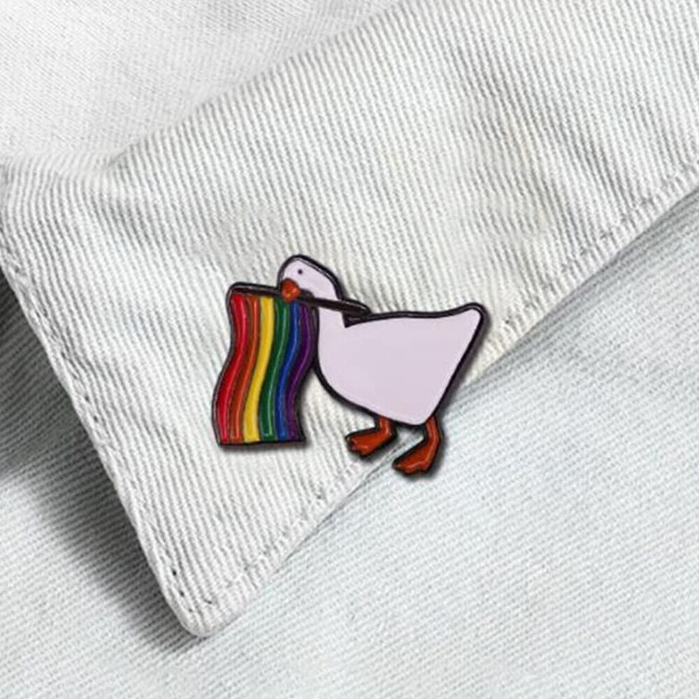 Show off your silly side with this playful Goose with Pride Flag Pin! Perfect for adding a splash of fun and pride to any outfit, this quirky pin lets you celebrate who you are with a wink and a honk. Wear it proudly and let your inner goose strut its stuff!