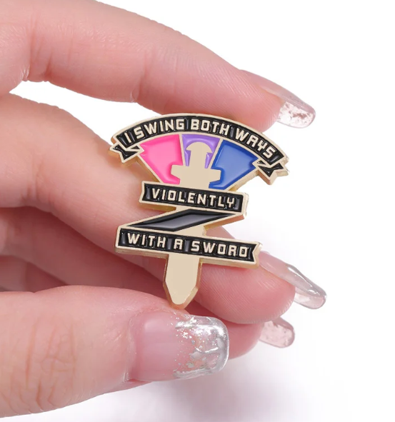 Be proud and show off your fluid nature with our "I Swing Both Ways" pin. In gold enamel, this pin features a playful bisexual graphic, making it the perfect conversation starter for any outfit. Embrace your unique identity and wear it with pride!