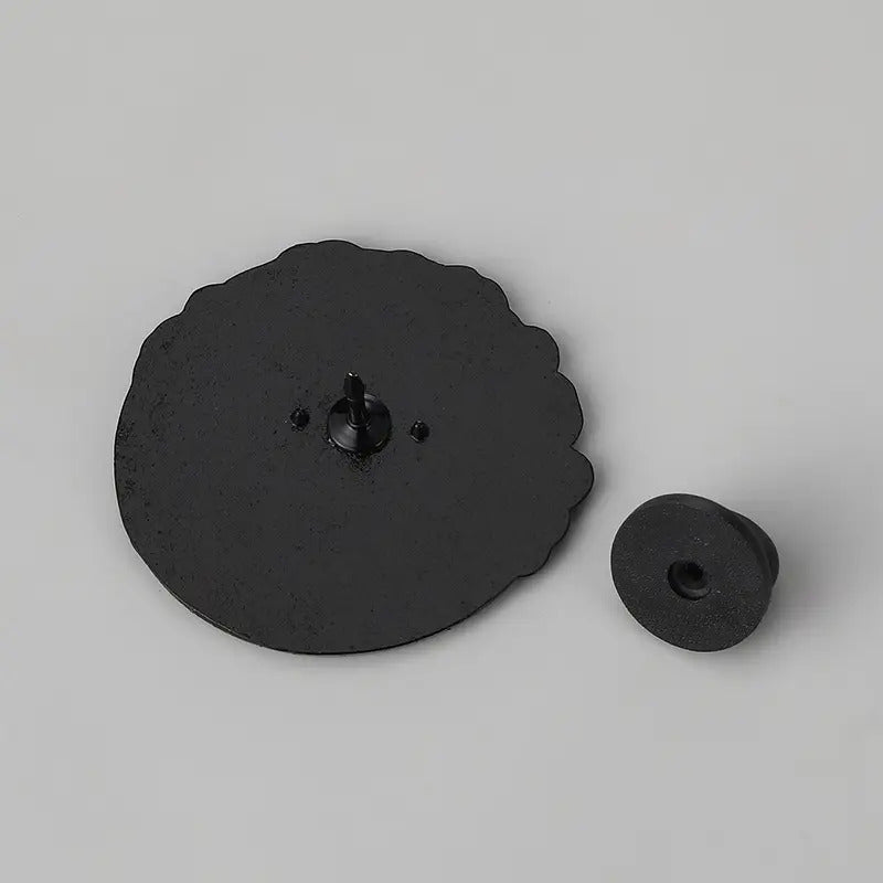 Size: 1 1/4"W x 1 1/8"H black enamel pin